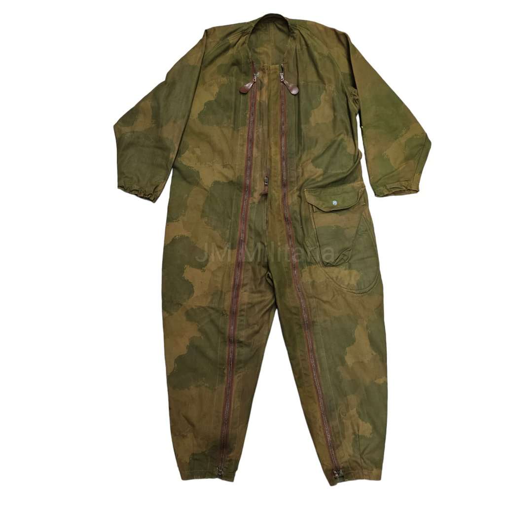RARE SOE / OSS Jumpsuit. British made jumpsuit for use with the British SOE (Special Operations Executive) or US OSS (Office of Strategic Services). These jumpsuits, also known as ‘Striptease suits’ were worn on top of civilian clothing by secret agents dropped over occupied territory. These suits were to be worn during the jump and immediately discarded after. These coveralls are made in a heavy duck with hand screened camouflage pattern, there are different camouflage colors for the suits, this is the dark colored camouflage version which is the nicest in my opinion. This jumpsuit is in very good condition, nice colours, with the long zippers in working condition, small zipper is not moving (probably easy to fix). All zippers are having the leather parts present. The press-stud on the small left arm pouch, what is intended to hold the knife, is missing the upper part for the press-stud. The backpack is removed. Leather piece with buckle is not present. Size 2.