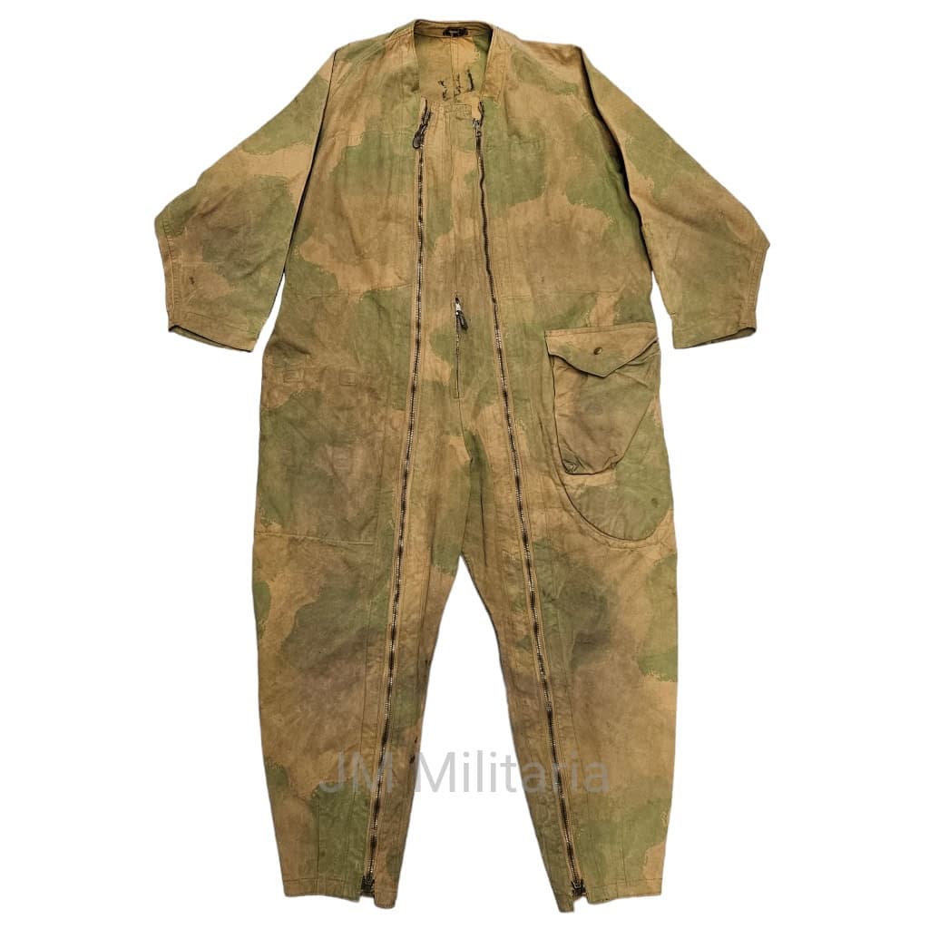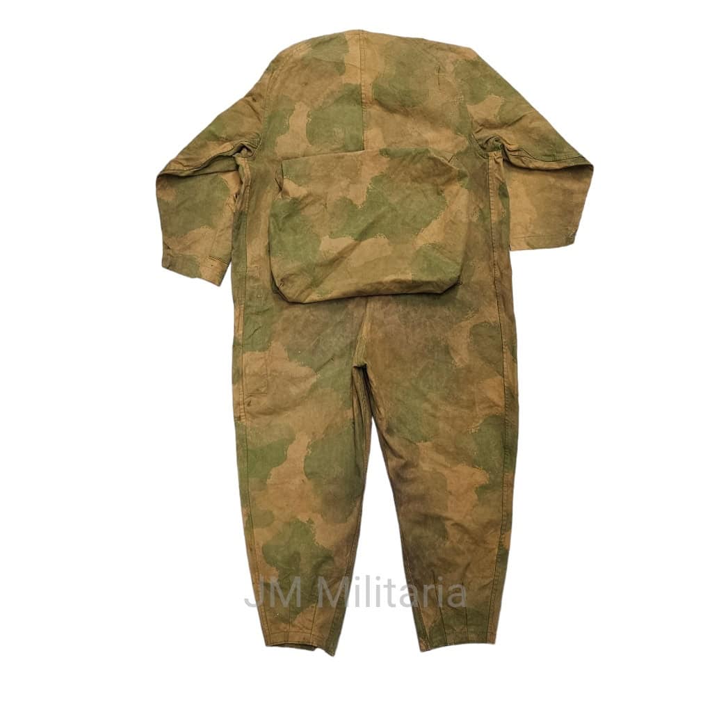 SOE / OSS Jumpsuit. WW2 British made jumpsuit for use with the British SOE (Special Operations Executive) or US OSS (Office of Strategic Services). These jumpsuits, also known as ‘Striptease suits’ were worn on top of civilian clothing by secret agents dropped over occupied territory. These suits were to be worn during the jump and immediately discarded after. These coveralls are made in a heavy duck with hand screened camouflage pattern, there are different camouflage colors for the suits, this is the light coloured camouflage version. This jumpsuit is in good condition, shows traces of usage. All zippers are in working condition. The backpack is still present! Leather piece with buckle is not present.