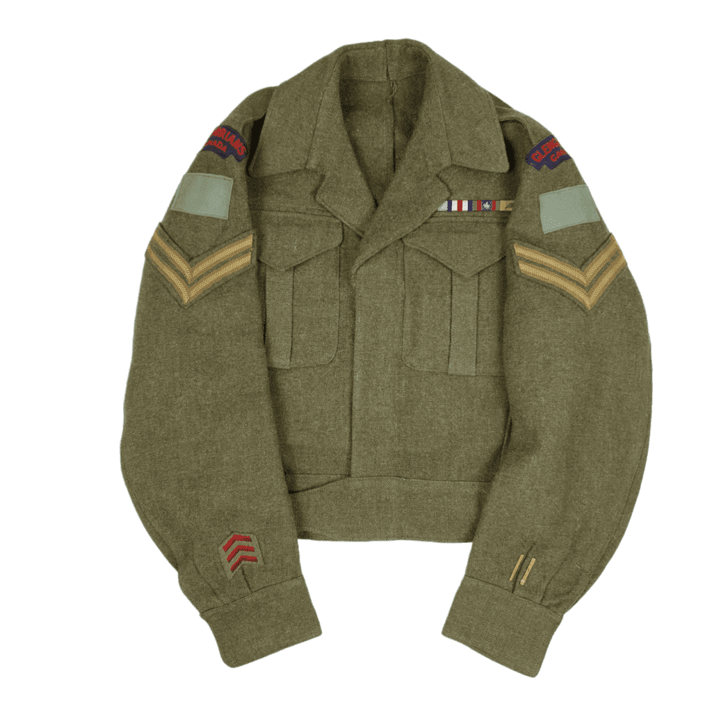 Original WW2 ‘Stormont Dundas & Glengarry Highlanders’ (SD&G) Battle Dress worn by Cpl. John James Pasquino with army number C-53145. Cpl. Pasquino enlisted and served overseas with the SD&G what was part of the 3rd Canadian Infantry Division and was awarded with Mention in Despatches (MID) for recognition of gallant and distinguished services. He was wounded in action twice. The jacket has original applied insignia, SD&G shoulder titles, 3rd Canadian Infantry Division patches, Corporal rank chevrons, ribbons including the MID, two wound stripes on left lower sleeve and three service chevrons. The tunic is maker marked, date is barely readable, in my opinion January 1943, there is also a AV marking what indicates it was treated with anti-gas (Anti-Vesicant) dated 1945. The collar has been opened up for a more stylish look. Stunning Battle Dress tunic, wounded twice!