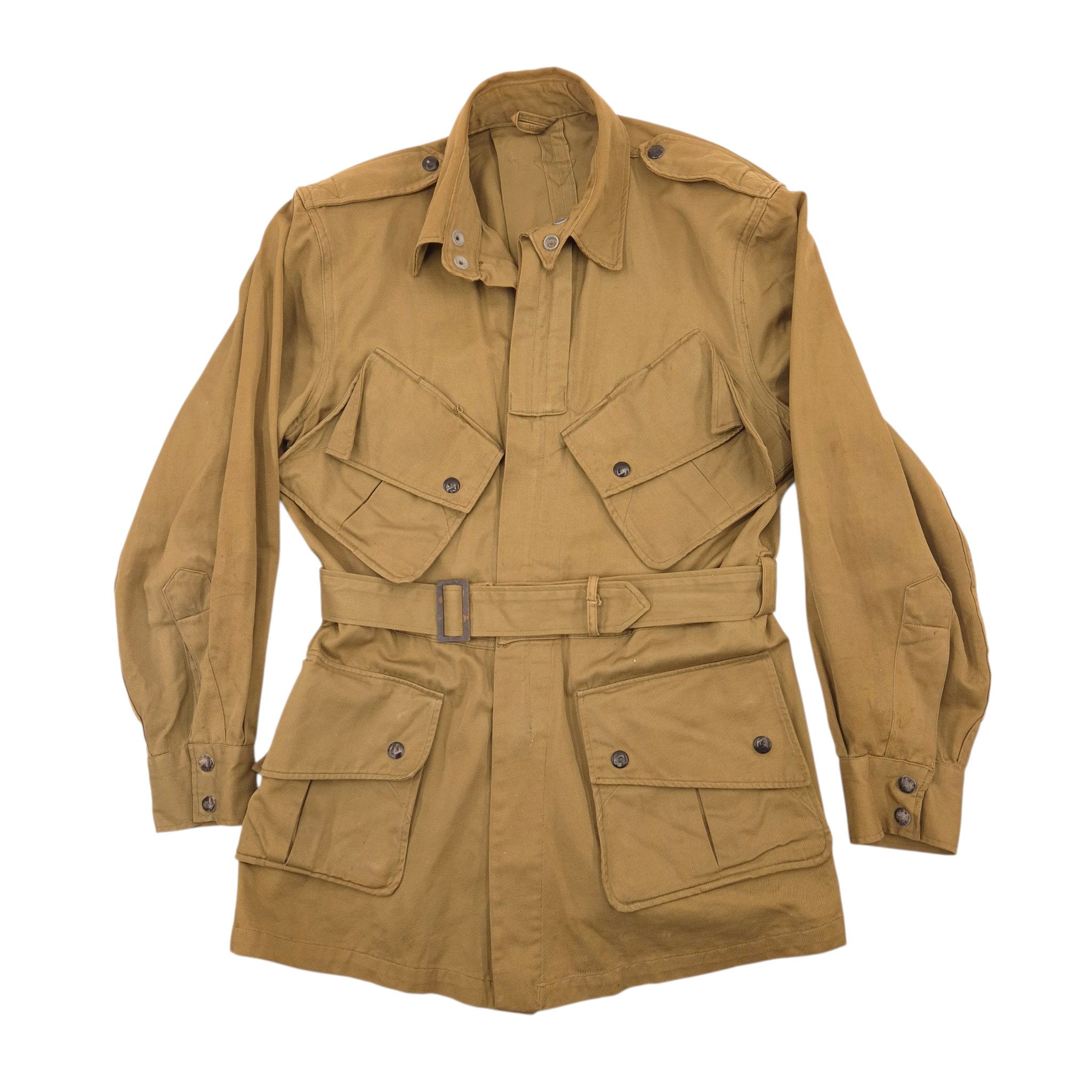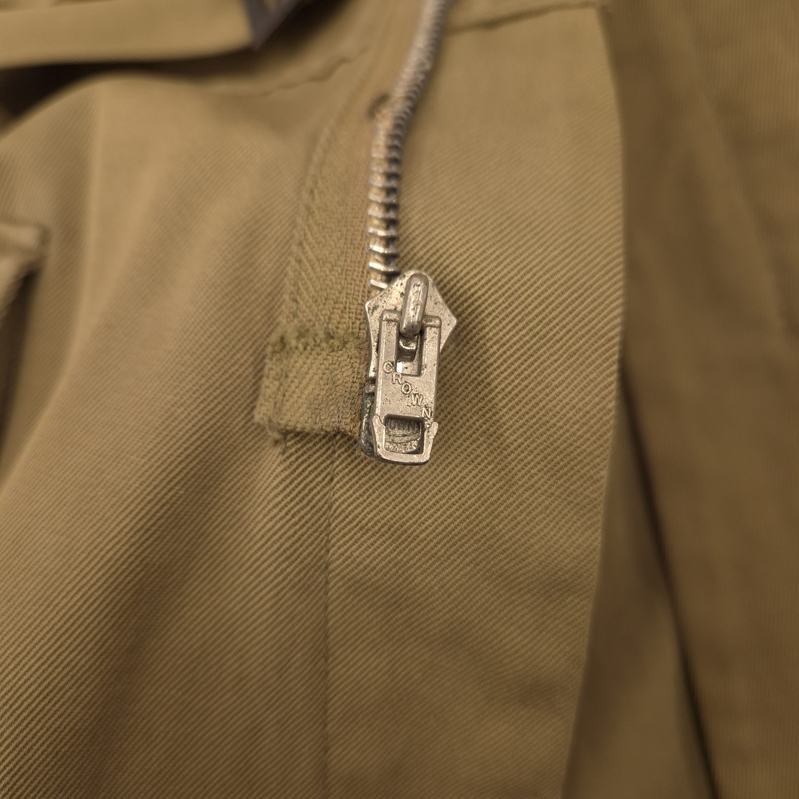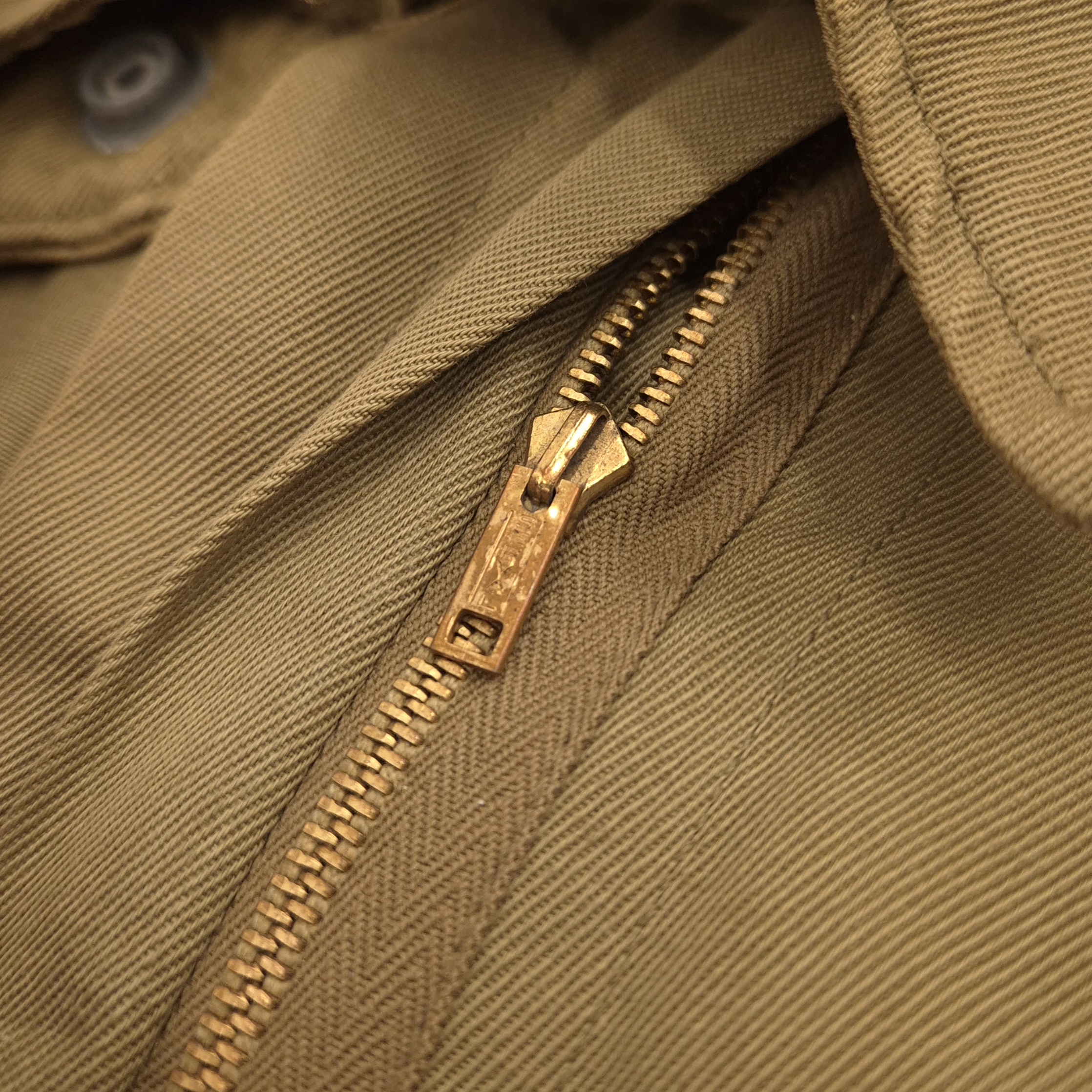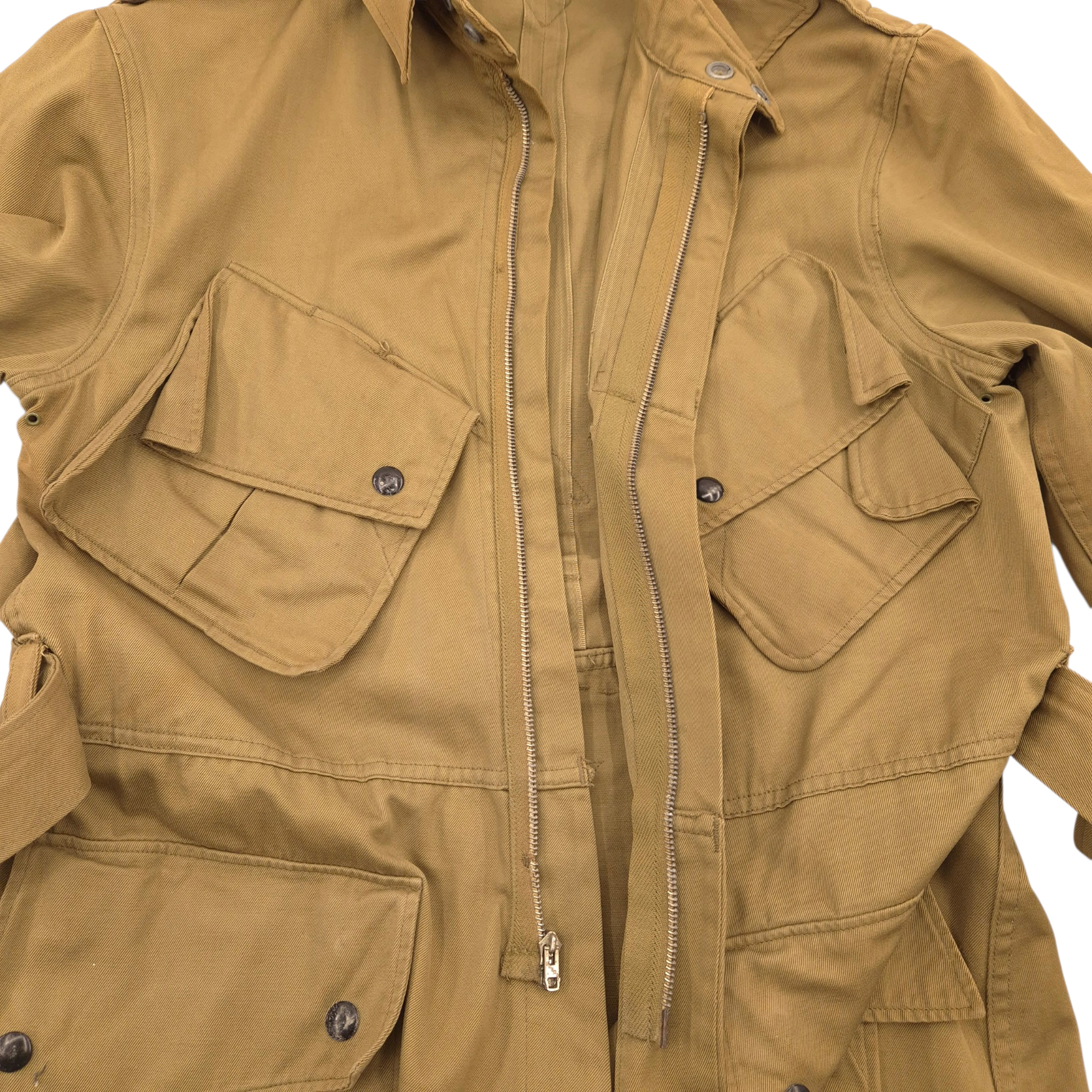 Original WWII U.S. Airborne M1942 Jump Jacket in very good condition. Famously worn by members of the 101st Airborne Division during D-Day in Normandy and Operation Market Garden. Both zippers are present; however, the main zipper has a missing tooth, so it cannot be fully closed. The pull is made by “Crown” USA. All original press studs are present, though two on the right sleeve show some rust (which may be cleanable). The often missing waist belt is still intact. The jacket features a clear and readable maker’s label from ROGOL MFG. Co., dated April 1943, size 40R, a desirable size.