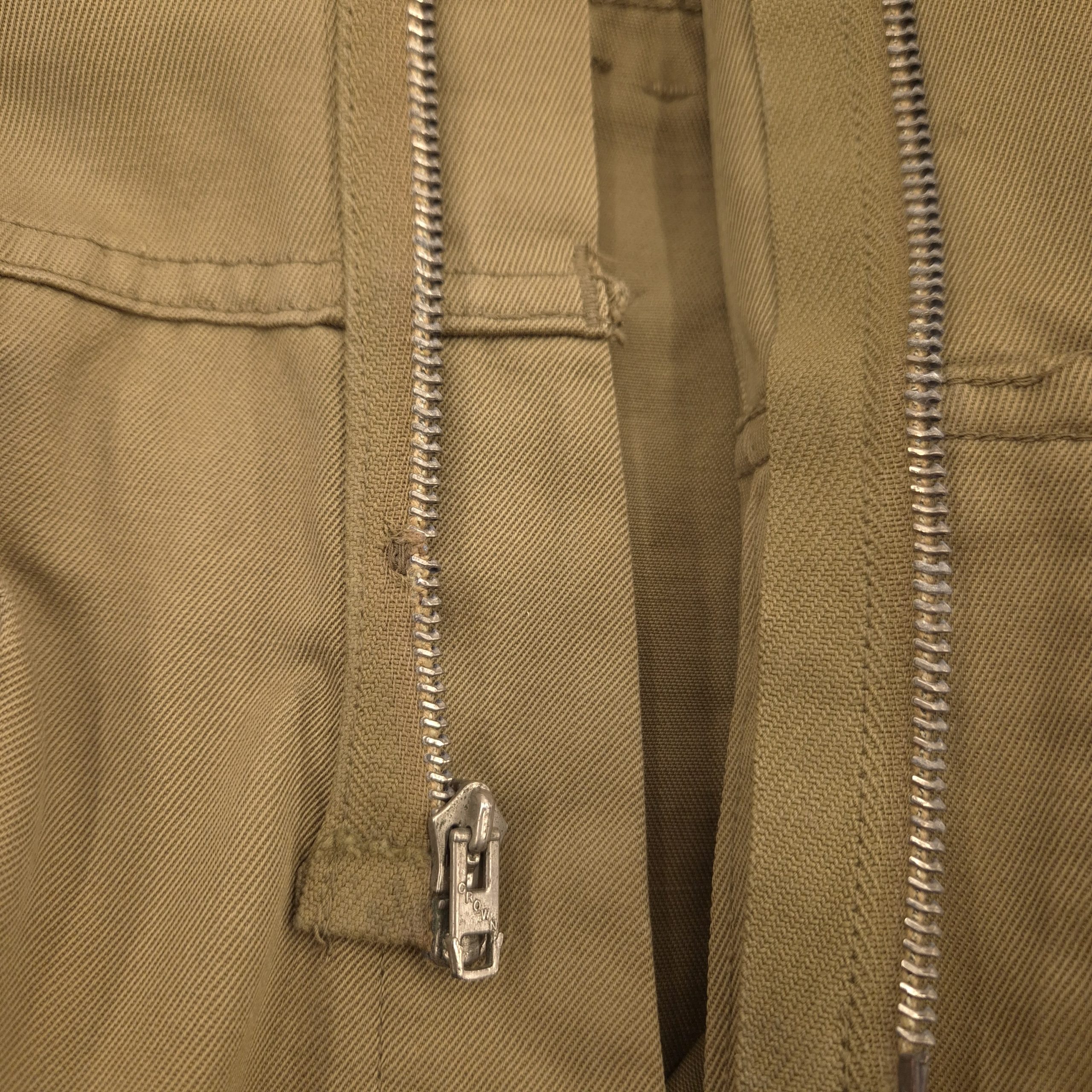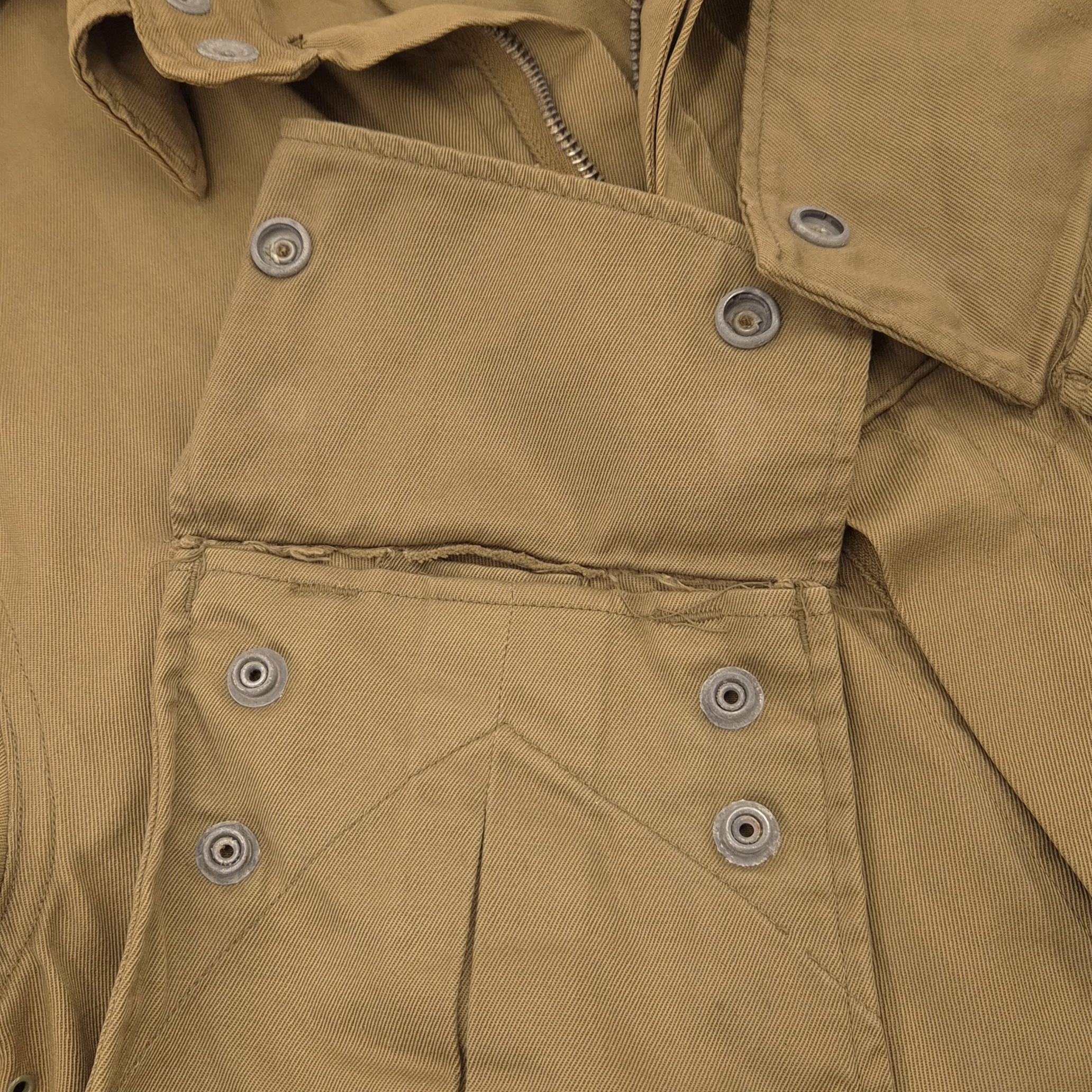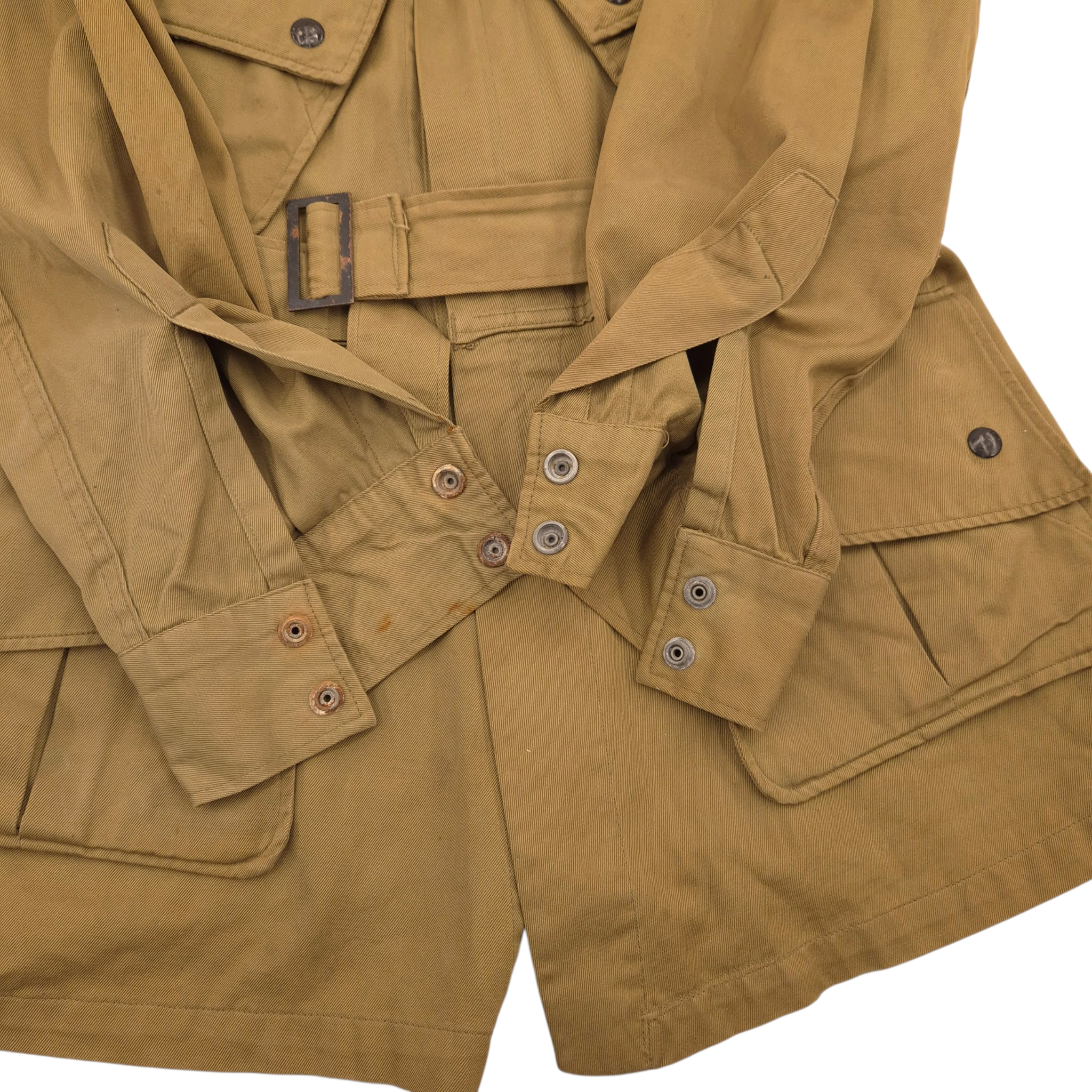 Original WWII U.S. Airborne M1942 Jump Jacket in very good condition. Famously worn by members of the 101st Airborne Division during D-Day in Normandy and Operation Market Garden. Both zippers are present; however, the main zipper has a missing tooth, so it cannot be fully closed. The pull is made by “Crown” USA. All original press studs are present, though two on the right sleeve show some rust (which may be cleanable). The often missing waist belt is still intact. The jacket features a clear and readable maker’s label from ROGOL MFG. Co., dated April 1943, size 40R, a desirable size.