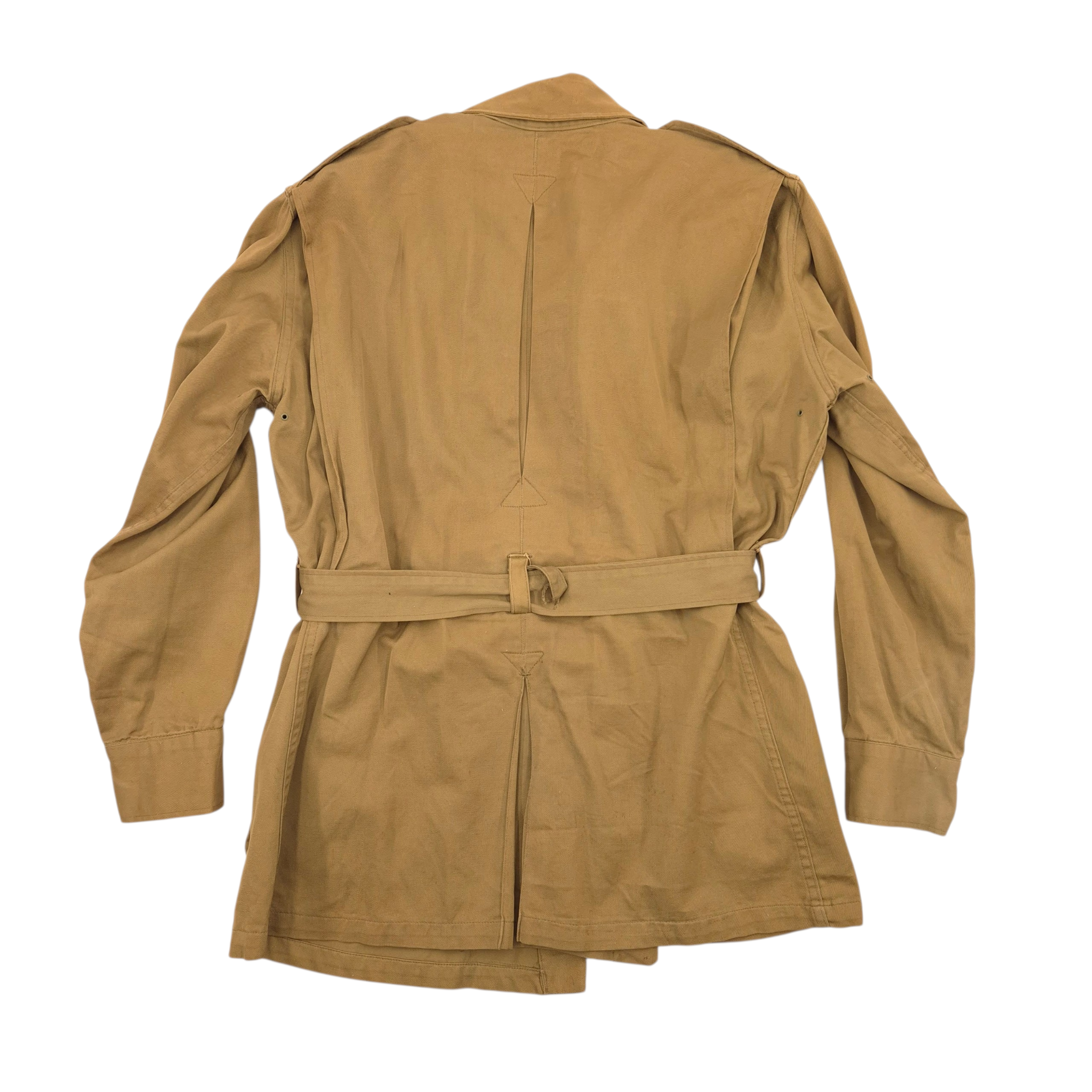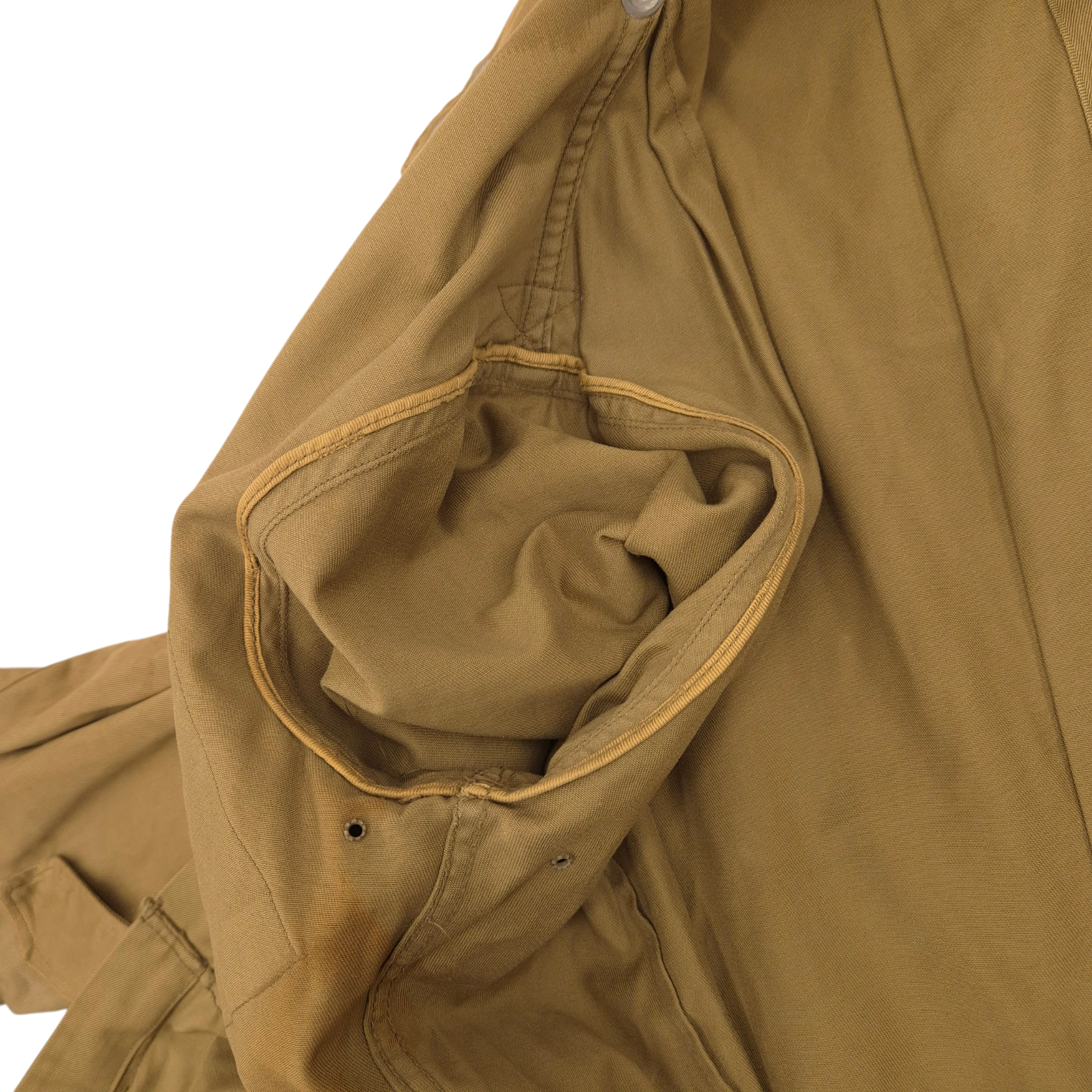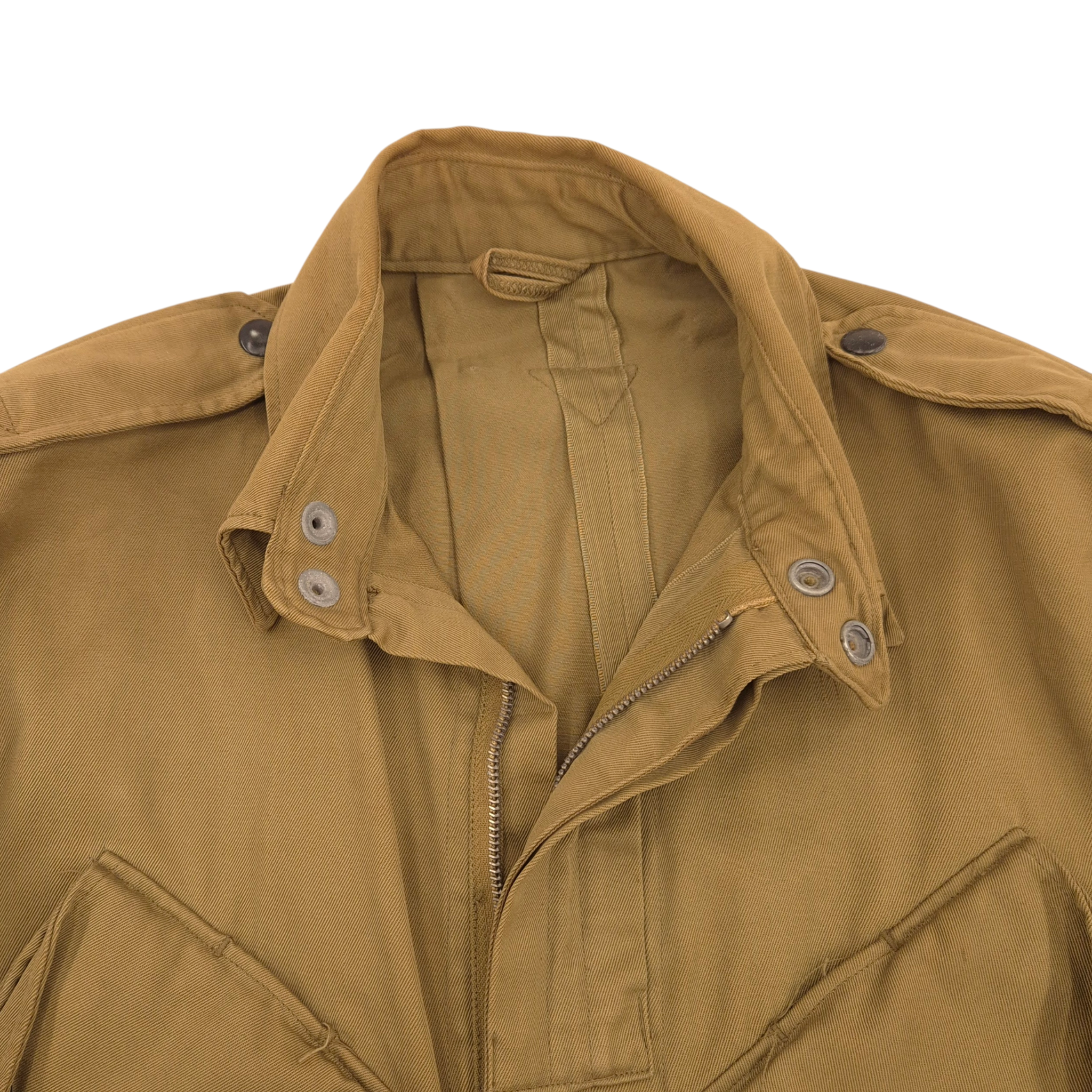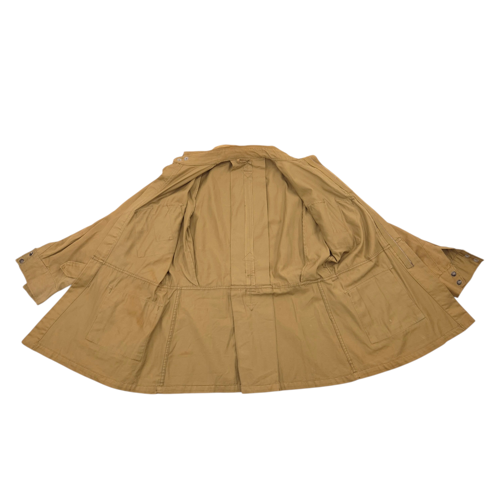 Original WWII U.S. Airborne M1942 Jump Jacket in very good condition. Famously worn by members of the 101st Airborne Division during D-Day in Normandy and Operation Market Garden. Both zippers are present; however, the main zipper has a missing tooth, so it cannot be fully closed. The pull is made by “Crown” USA. All original press studs are present, though two on the right sleeve show some rust (which may be cleanable). The often missing waist belt is still intact. The jacket features a clear and readable maker’s label from ROGOL MFG. Co., dated April 1943, size 40R, a desirable size.