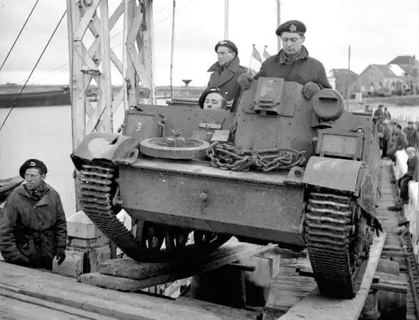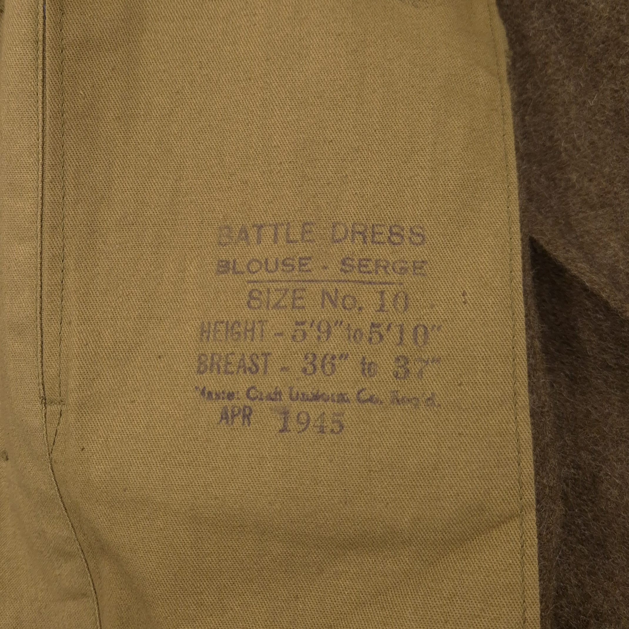 Original WWII VIII Cdn (Canadian) RECCE (Reconnaissance) Regiment (14th Canadian Hussars) battle dress jacket, featuring Lance-Corporal rank chevrons. This is an original, period-badged example with British-made embroidered “8th RECCE” shoulder titles, melton/paper-backed 2nd Canadian Infantry Division formation patches, and three service-year chevrons. All insignia are nicely sunken into the fabric. The battle dress jacket remains in worn condition and was period-shortened by a tailor. It is maker-marked and dated April 1945, size 10.