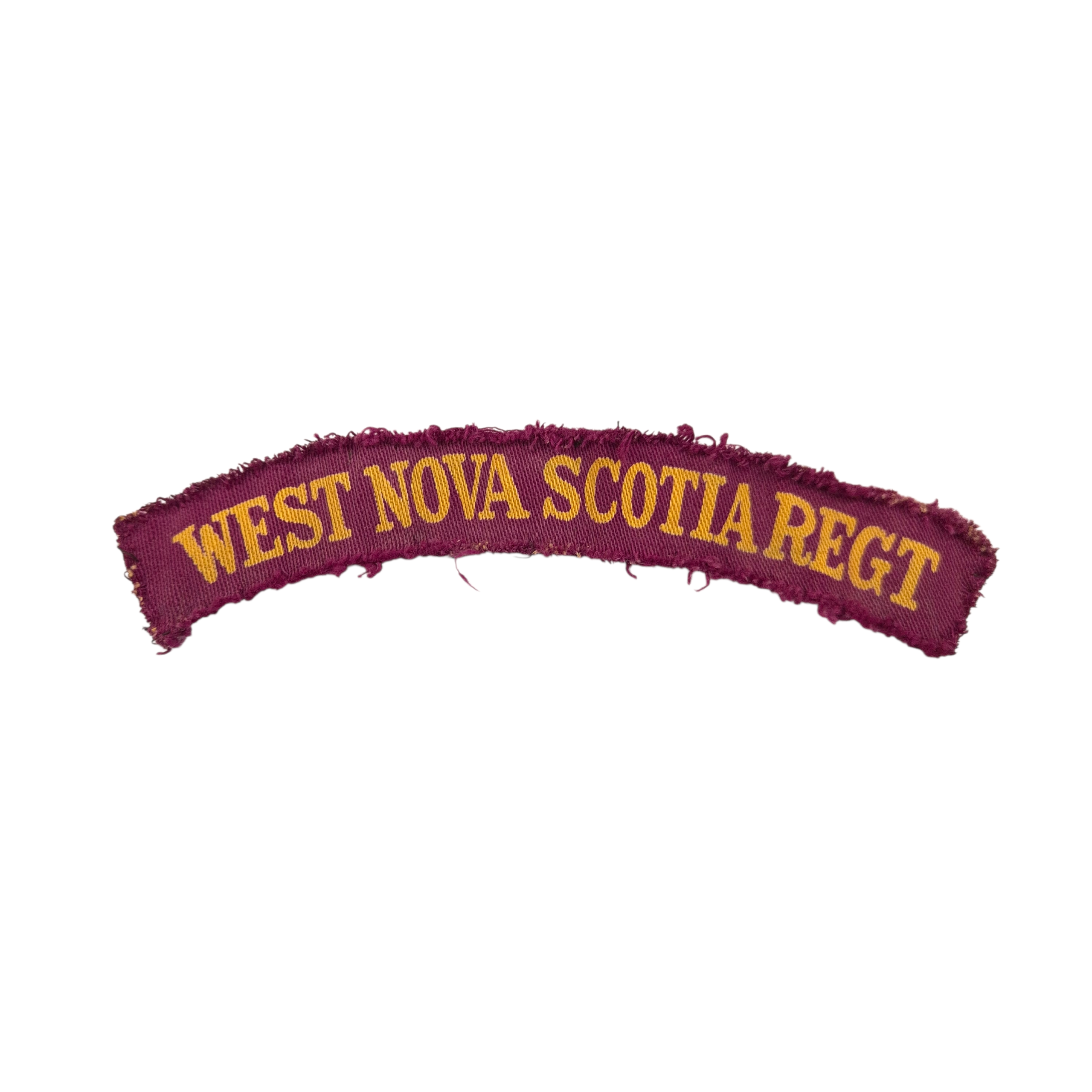 Original WWII West Nova Scotia Regiment (WNSR) printed shoulder title in uniform removed condition. English-made shoulder title for Canadian troops overseas. West Nova Scotia Regiment were part of the 1st Canadian Infantry Division.