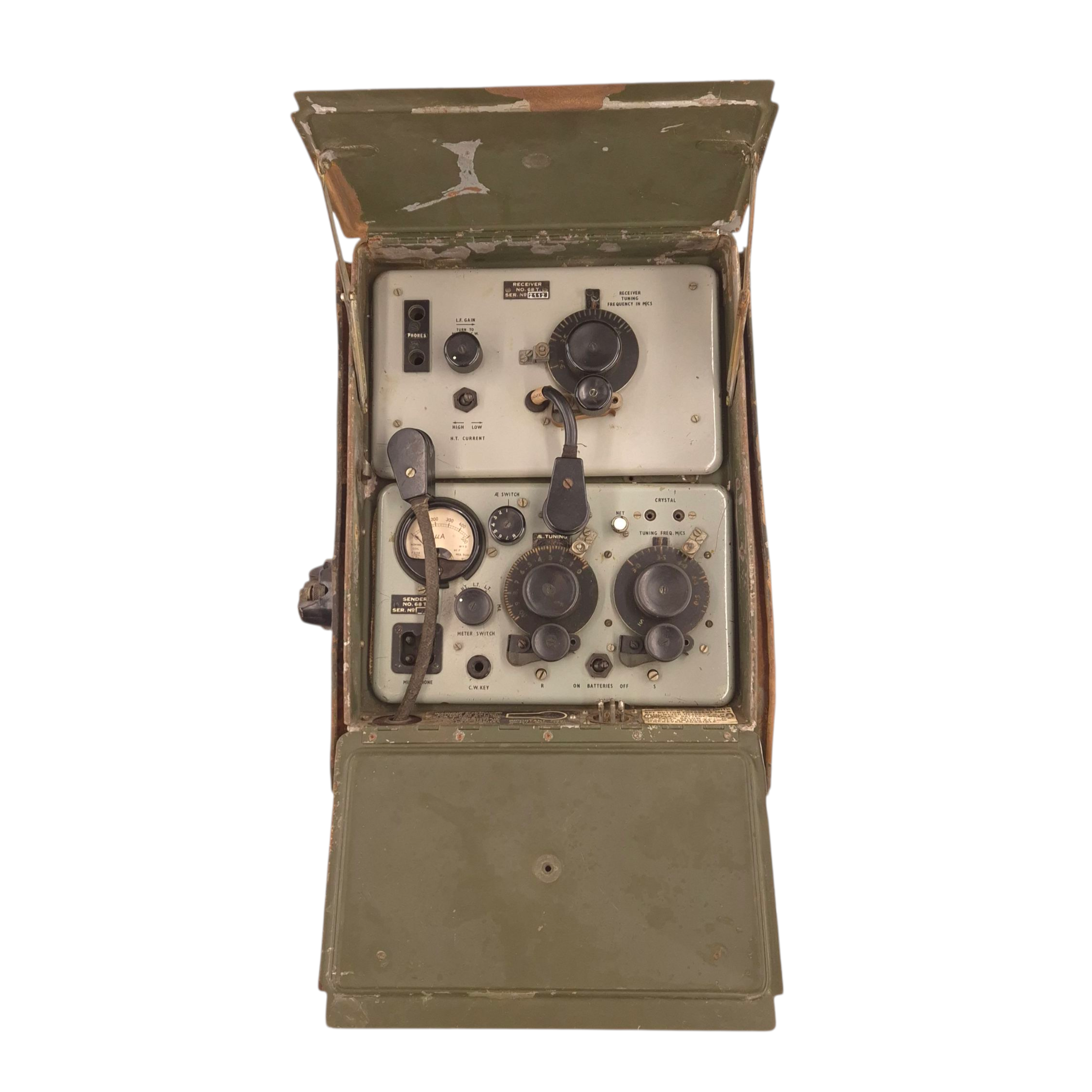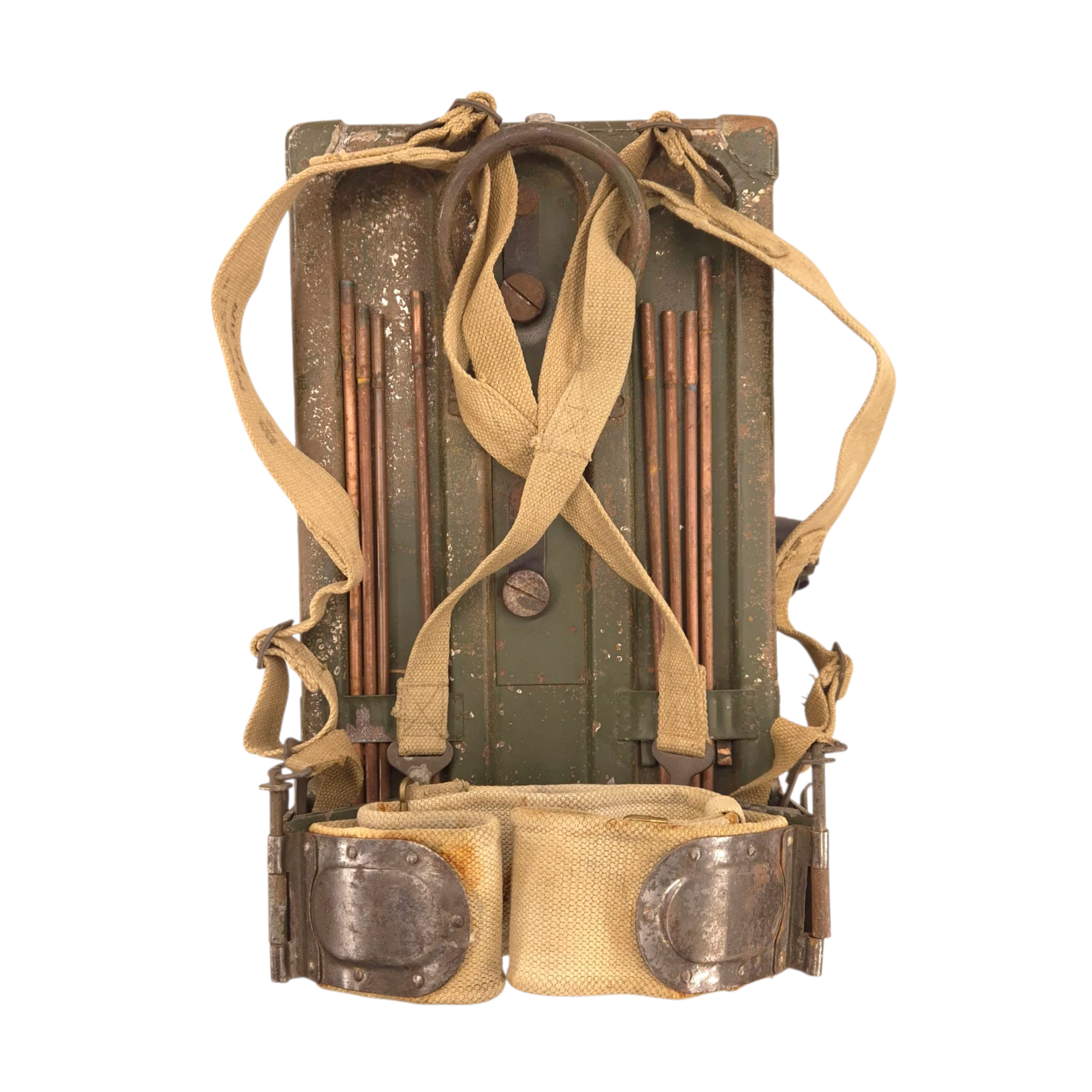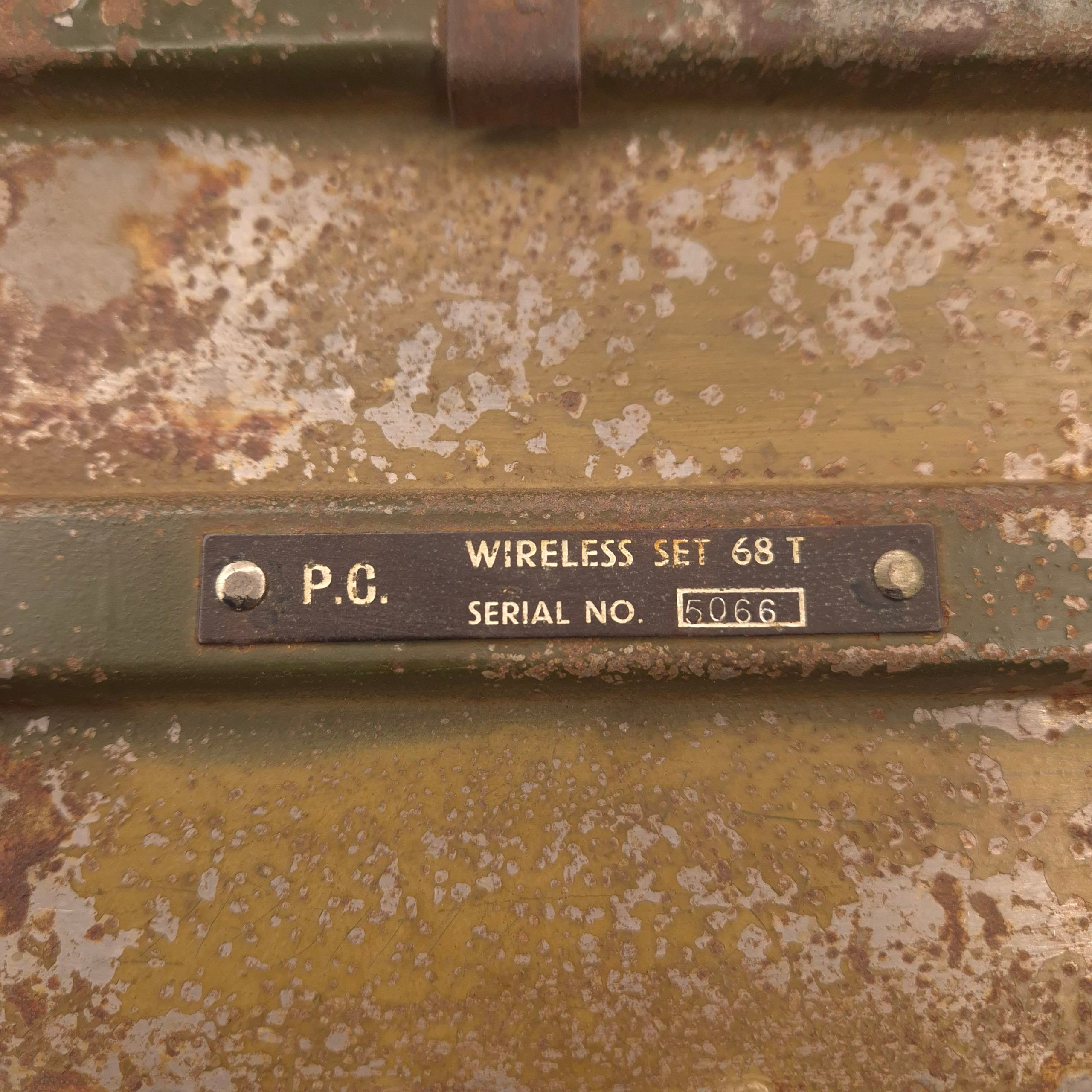 Original WWII Wireless Set No. 68 T (WS68) backpack radio. This is a genuine WS68 backpack radio in field used condition. The radio is complete with its original waist belt and shoulder straps, and features 19 antennas stored on the sides. The set has its original wartime paint. The WS68 is considerably rarer and harder to find than the more common WS18. The rubber ring behind the moving coil is loose but present. A great piece for display.