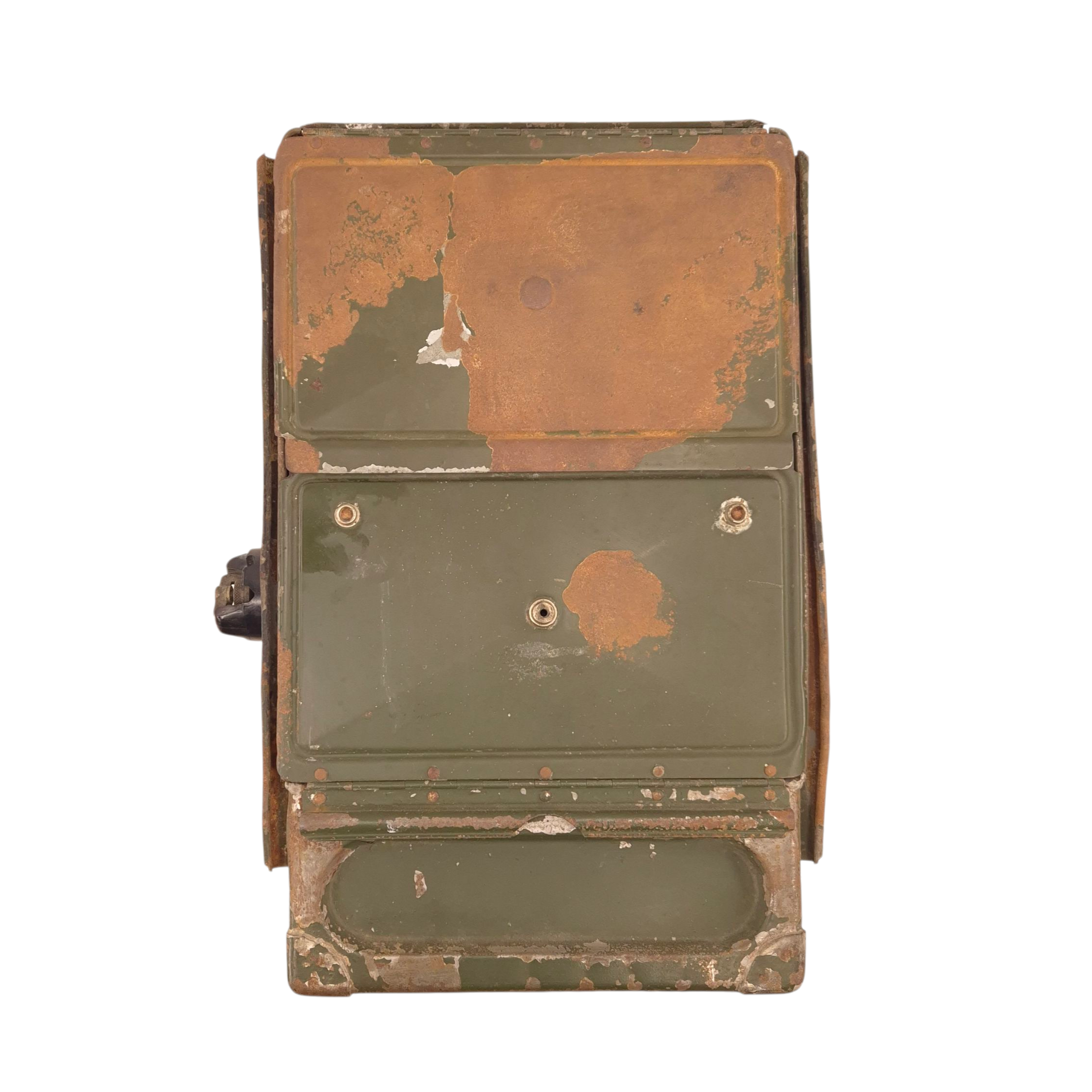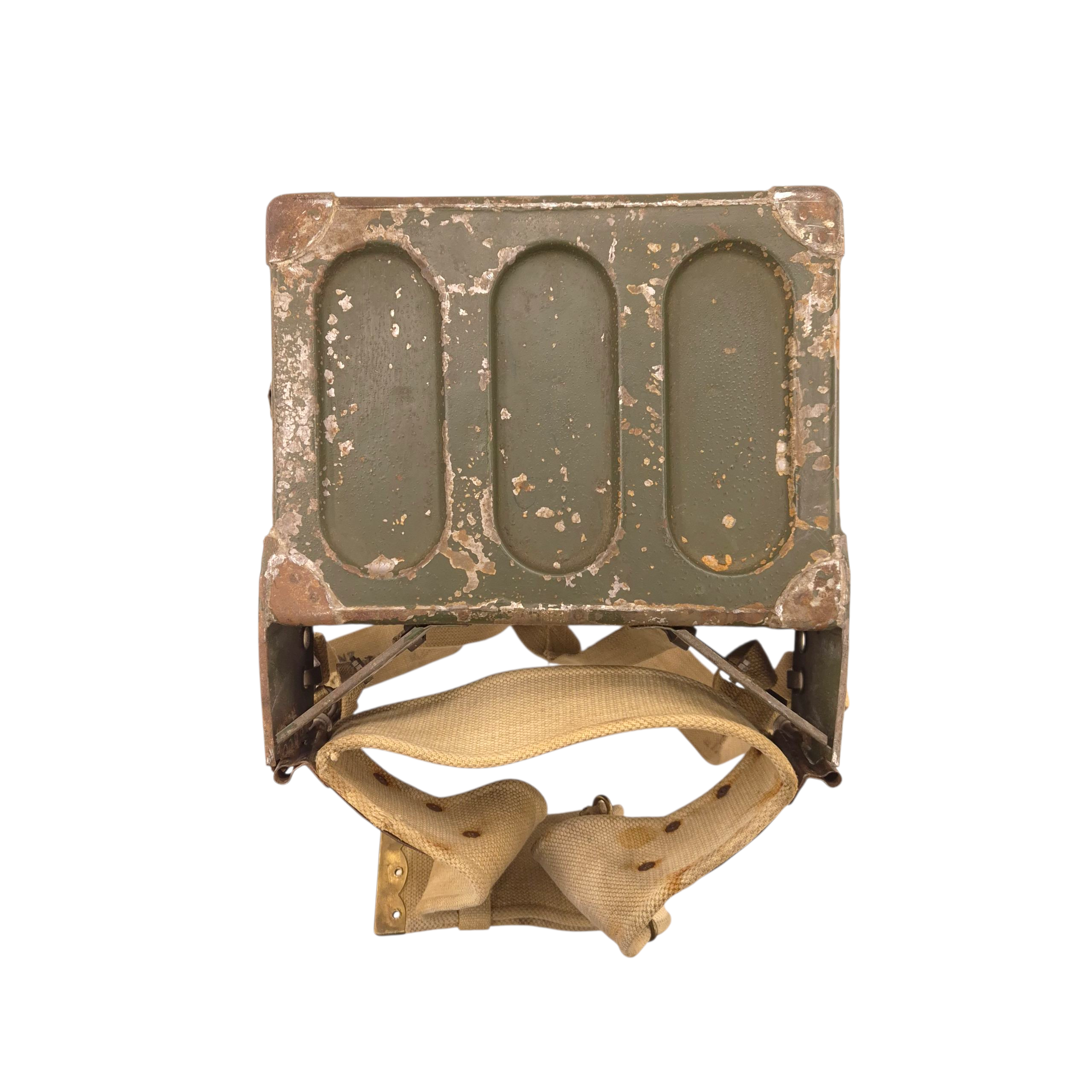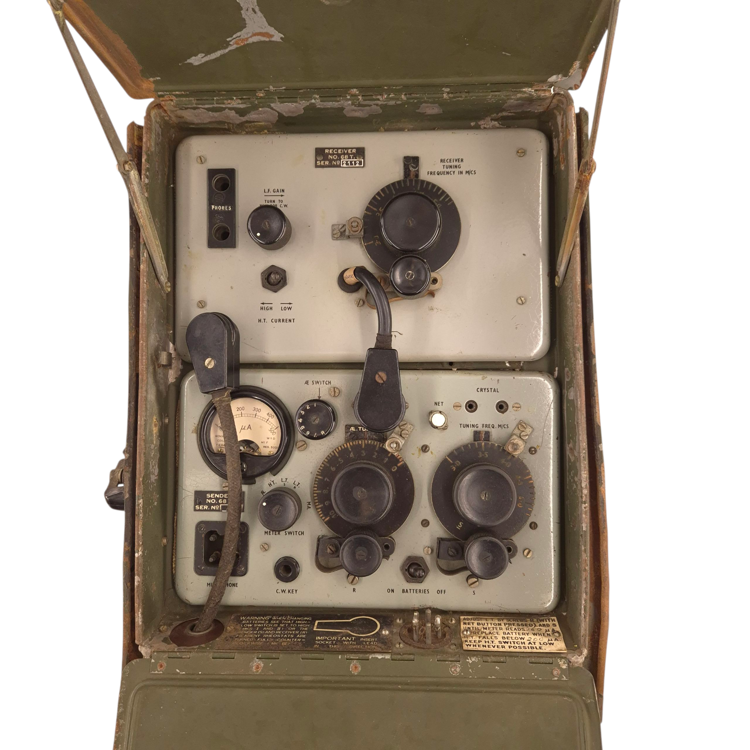 Original WWII Wireless Set No. 68 T (WS68) backpack radio. This is a genuine WS68 backpack radio in field used condition. The radio is complete with its original waist belt and shoulder straps, and features 19 antennas stored on the sides. The set has its original wartime paint. The WS68 is considerably rarer and harder to find than the more common WS18. The rubber ring behind the moving coil is loose but present. A great piece for display.