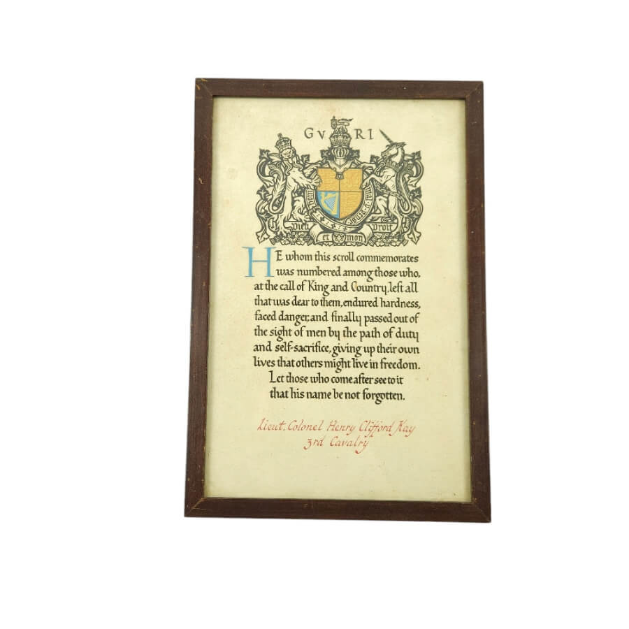 Original WW1 British death plaque certificate to Lieutenant-Colonel Henry Clifford Kay who served the 3rd Cavalry. We haven’t done any research to Lieutenant-Colonel KAY since we obtained this certificate. Nicely framed.